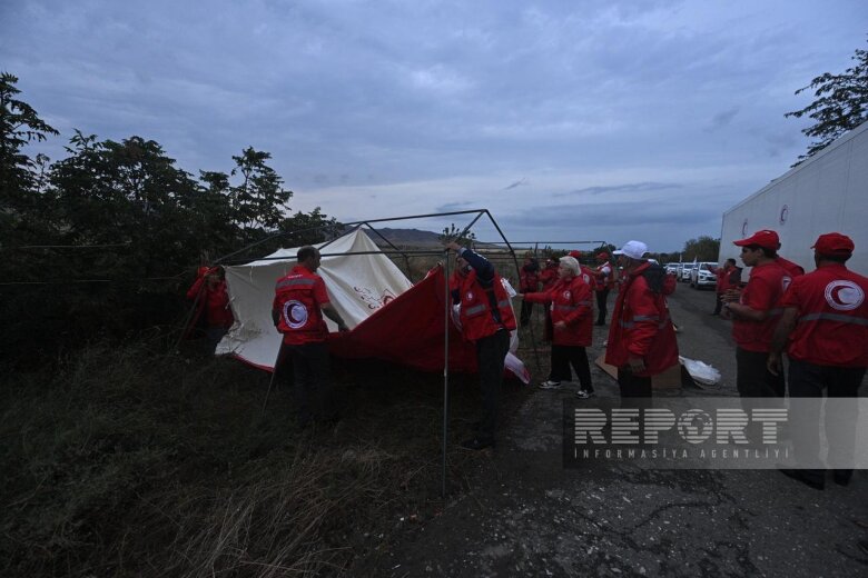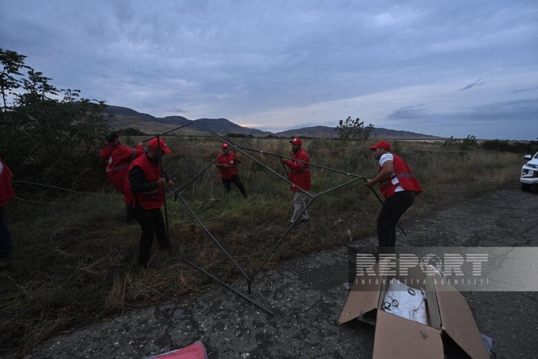 Azərbaycan Qızıl Aypara Cəmiyyəti (AzQAC) Rusiya sülhməramlılarının Ağdam-Xankəndi yolunun üzərindəki postu ilə üzbəüz istiqamətdə çadırlar quraşdırırlar.