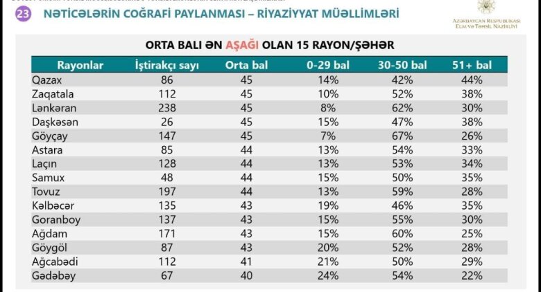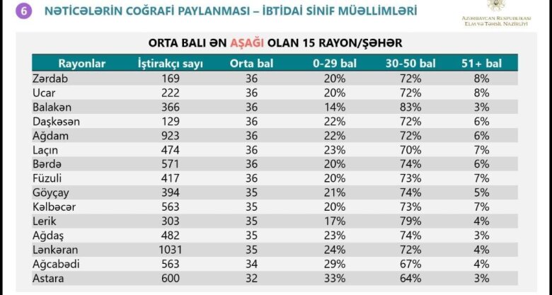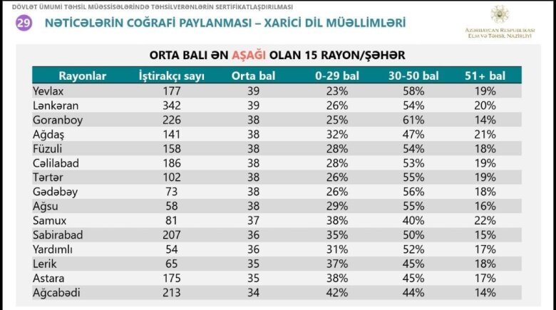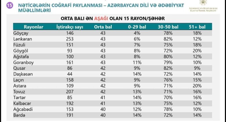 "Siyahı üzrə ilk sırada Azərbaycan dili və ədəbiyyat fənni üzrə Tərtər, Bərdə, Daşkəsən (hər üçü 14%), riyaziyyat fənnindən Gədəbəy (24%), Göygöl (20%), Ağcabədi (21%), xarici dil fənni üzrə isə Ağcabədi (42%), Astara (38%), Lerik rayonundan (37) olan müəllimlər olub".