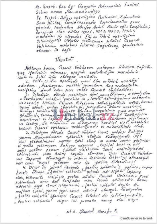 Elm və Təhsil Nazirliyinin mətbu orqanı olan “Azərbaycan məktəbi” jurnalının sabiq baş redaktoru Rahil Nəcəfov həbs olunmasına görə nazirliyin ictimaiyyətlə əlaqələr sektorunun müdiri işləmiş, hazırda mədəniyyət nazirinin müşaviri vəzifəsində çalışan Cəsarət Valehovu ittiham edir.