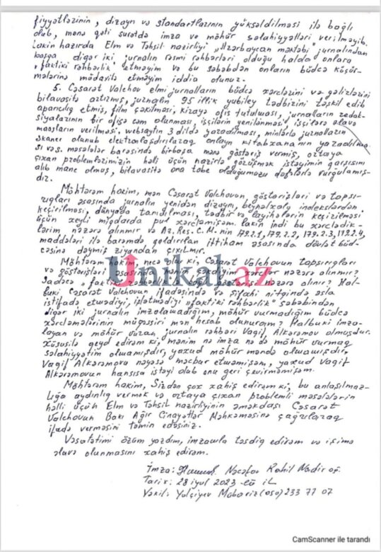 Vəkil Mübariz Yolçuyev Rahil Nəcəfovun öz dəsti-xətti ilə yazdığı vəsatəti də redaksiyaya təqdim edib.