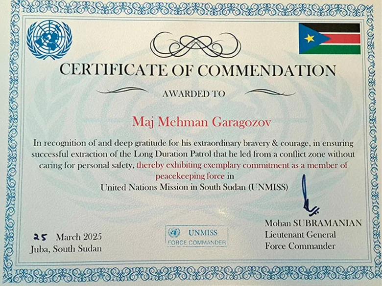 Reyting.az Müdafiə Nazirliyinə istinadla xəbər verir ki, hərbi müşahidəçi qismində xidmət edən mayor Qaragözov Mehman Həmdiyə oğlu missiyada xidməti vəzifələrini nümunəvi şəkildə yerinə yetirdiyinə görə UNMISS-in Təhlükəsizlik Qüvvələrinin komandanı general-leytenant Mohan Subramanian tərəfindən medal və fəxri fərmanla təltif edilib.