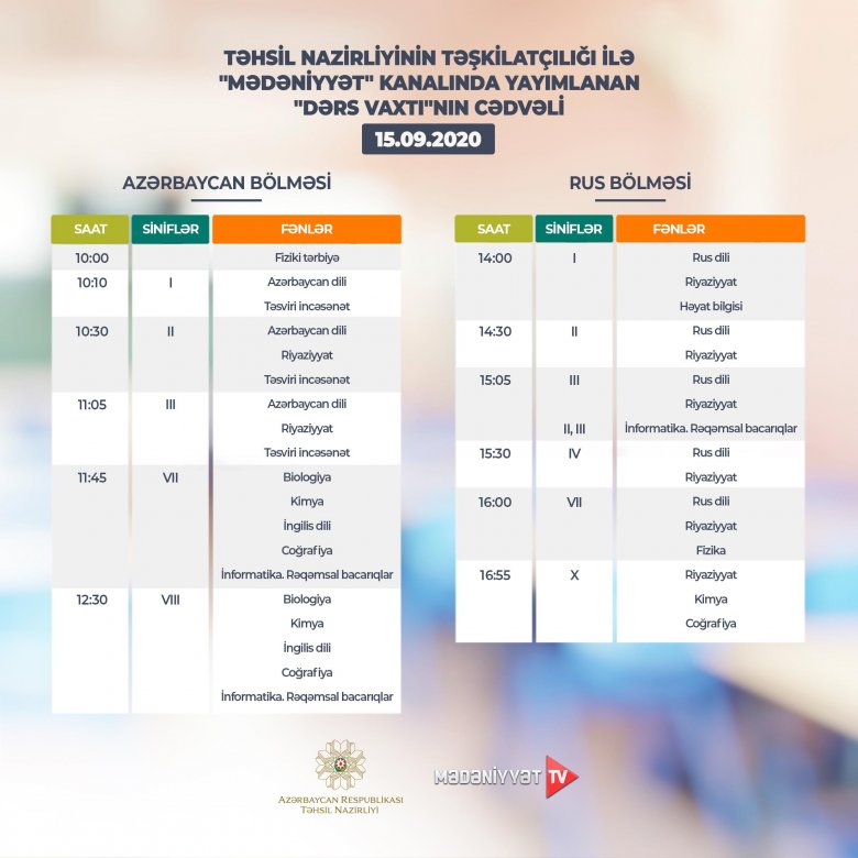 "Mədəniyyət", "ARB Günəş" telekanalları və "Təhsil" televiziyasının "Facebook" səhifəsində yayımlanan “Dərs vaxtı” proqramının sentyabrın 15-i üçün nəzərdə tutulan cədvəli açıqlanıb.