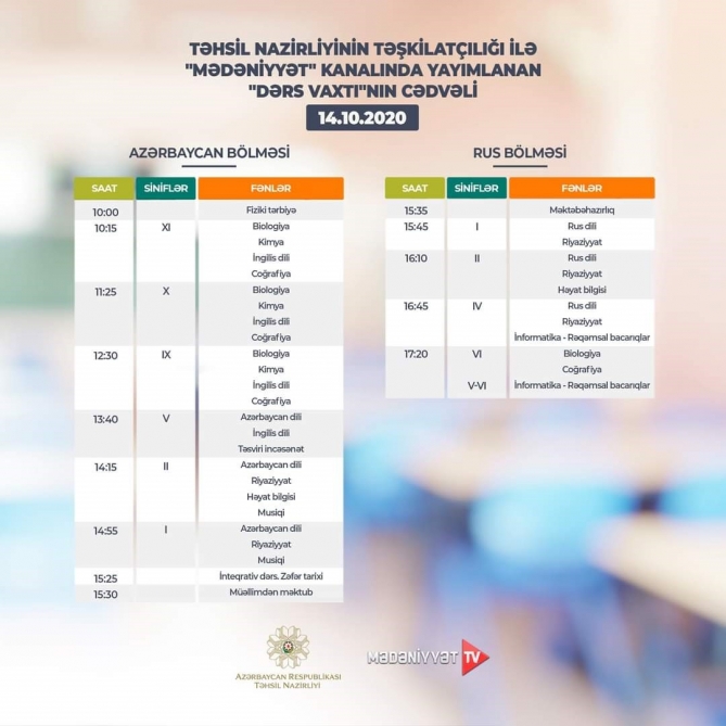 “Mədəniyyət”, “ARB Günəş” telekanalları və “Təhsil” televiziyasının “Facebook” səhifəsində yayımlanan “Dərs vaxtı” proqramının oktyabrın 14-ü üçün nəzərdə tutulan cədvəli açıqlanıb.