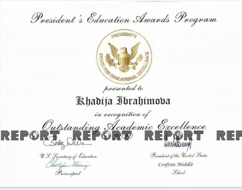 ABŞ-ın Merilend ştatının “Crofton” məktəbində təhsil alan həmyerlimiz, 14 yaşlı Xədicə İbrahimova təhsildə xüsusi müvəffəqiyyətlərinə görə Birləşmiş Ştatlar prezidenti Donald Trampın imzası ilə “Outstanding Academic Excellence” mükafatına layiq görülüb.