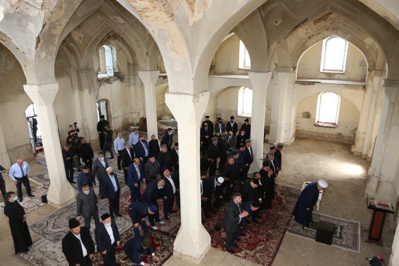 Qonaqlar məscidin indiki vəziyyəti ilə yaxından tanış oldular. 1993-cü ildən sonra ilk dəfə Ağdam “Cümə” məscidinin minarələrindən azan verildi və Şeyxülislam Allahşükür Paşazadənin pişnamazlığı ilə namaz qılındı. Quran tilavət olundu, dövlətimizin daha da qüdrətlənməsi üçün və şəhidlərimizin ruhuna dualar oxundu.