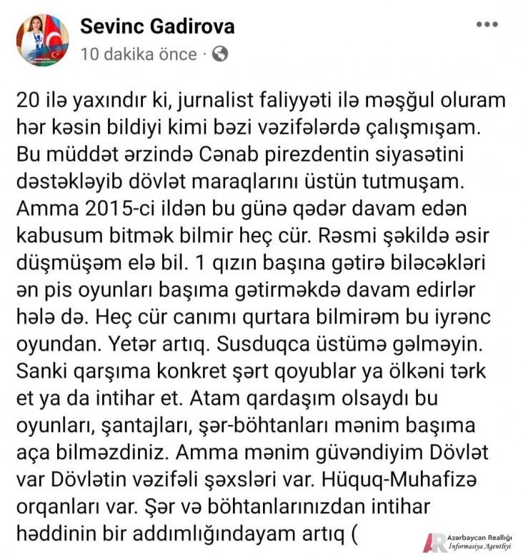 "20 ilə yaxındır ki, jurnalist faliyyəti ilə məşğul oluram. Hər kəsin bildiyi kimi, bəzi vəzifələrdə çalışmışam. Bu müddət ərzində Cənab Prezidentin siyasətini dəstəkləyib dövlət maraqlarını üstün tutmuşam. Amma 2015-ci ildən bu günə qədər davam edən kabusum bitmək bilmir".