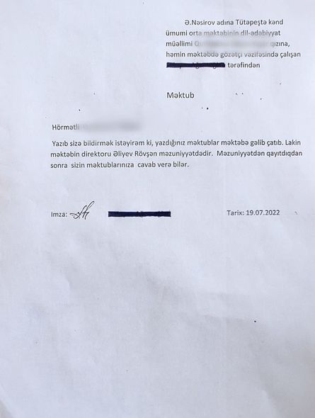 Belə ki, direktora məktub ünvanlayan müəllimlərdən birinə cavab qarovulçu adından verilib.