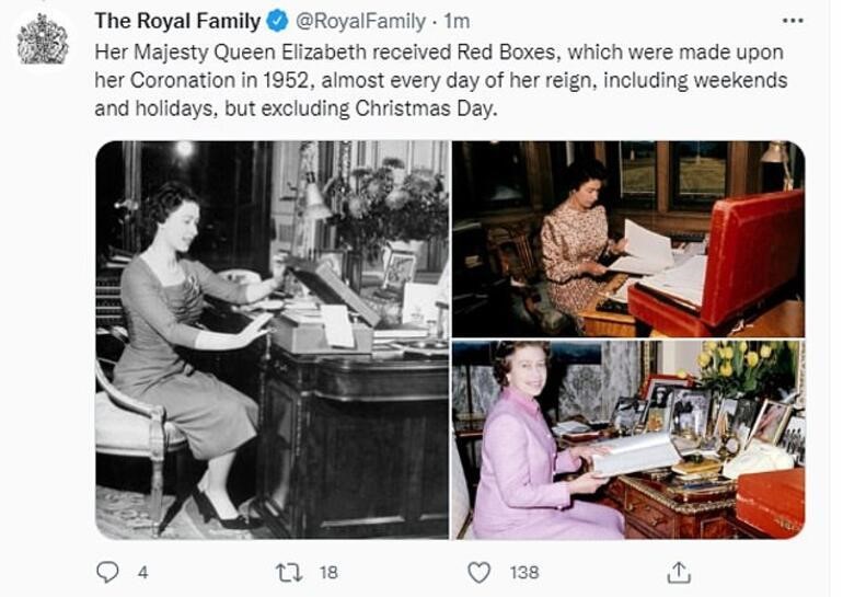 Onun hakimiyyəti dövründə mərhum Kraliça II Elizabet Milad günündən başqa hər gün bu qutulardan birini alırdı. Bu sənədlər, o cümlədən təkcə Böyük Britaniya hökumətinin deyil, həm də Birlik nümayəndələrinin sənədləri, dünyanın harasında olmasından asılı olmayaraq, özəl katibin ofisindən Krala qırmızı qutuda göndərilir. Bunlara imza tələb edən sənədlər, brifinq sənədləri və qarşıdan gələn görüşlər haqqında məlumatlar da daxildir.