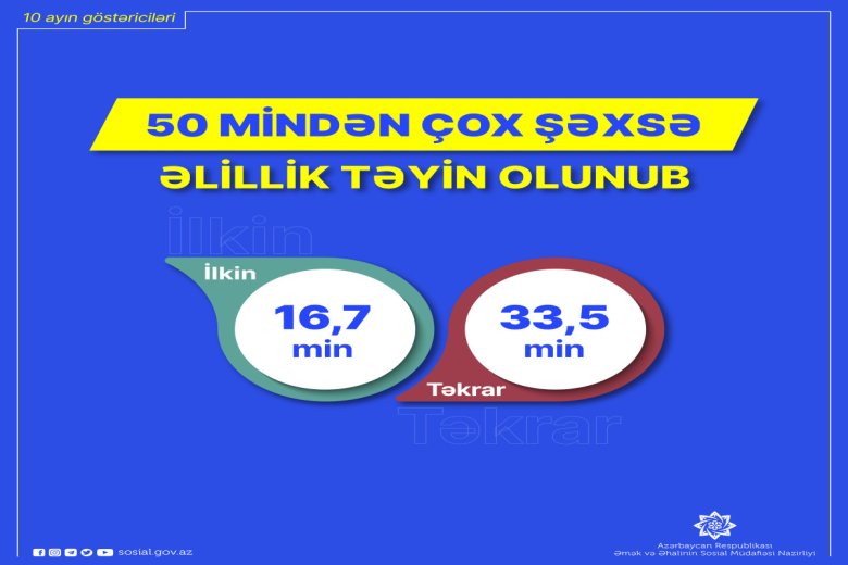 Məlumata görə, əlillik təyin edilən şəxslərdən 16,7 min nəfərinə ilkin, 33,5 min nəfərinə təkrar əlillik təyin olunub.