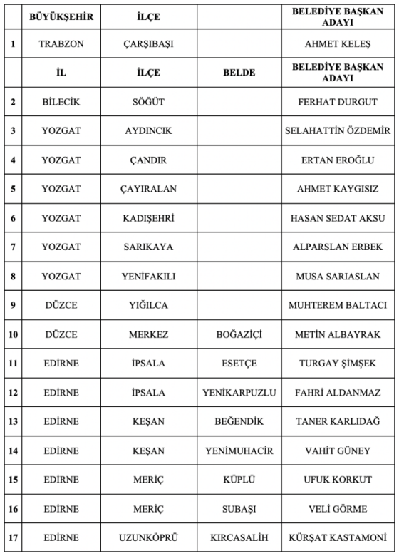 Reyting.az Türkiyə mətbuatına istinadla xəbər verir ki, MHP bu gün biri böyük şəhər, 8 rayon və 46 qəsəbə üzrə ümumilikdə 55 bələdiyyə sədrliyinə namizədlərini açıqlayıb.