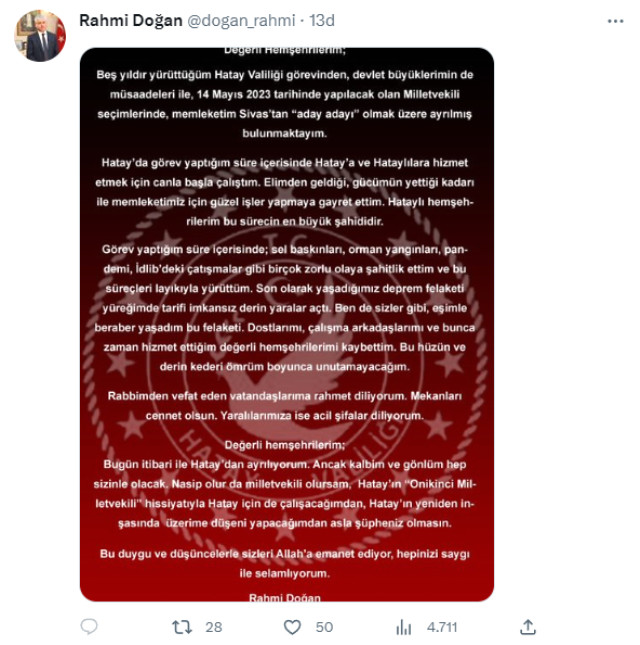 Reyting.az xəbər verir ki, zəlzələdən az sonra "məmləkətim Sivasdan parlament seçkilərində namizəd olmaq üçün Hatay valiliyi vəzifəsindən istefa verirəm",- deyərək, vəzifədən gedən Rəhmi Doğanın adı AK Partiyanın YSK-ya (MSK) təqdim etdiyi deputatlığa namizəd siyahısında yer almayıb.