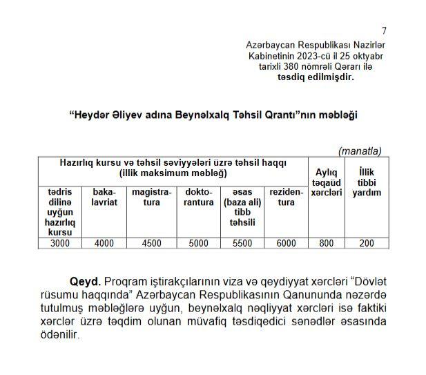 Eyni zamanda Heydər Əliyev adına Beynəlxalq Təhsil Qrantının illik məbləği müxtəlif təhsil səviyyələri üzrə müəyyən edilib, eləcə də digər xərclər nəzərdə tutulub.