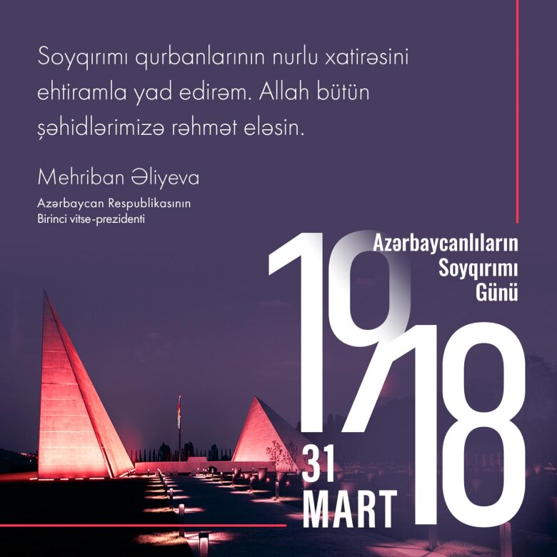 Birinci vitse-prezident Mehriban Əliyeva sosial şəbəkə hesabında 31 Mart – Azərbaycanlıların Soyqırımı Günü ilə bağlı paylaşım edib.