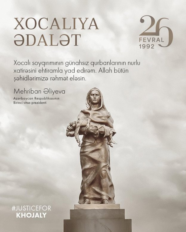 Azərbaycanın Birinci vitse-prezidenti Mehriban Əliyeva sosial şəbəkə hesabında Xocalı soyqırımının 33-cü ildönümü ilə bağlı paylaşım edib.