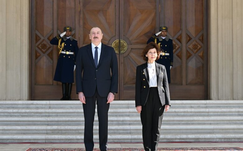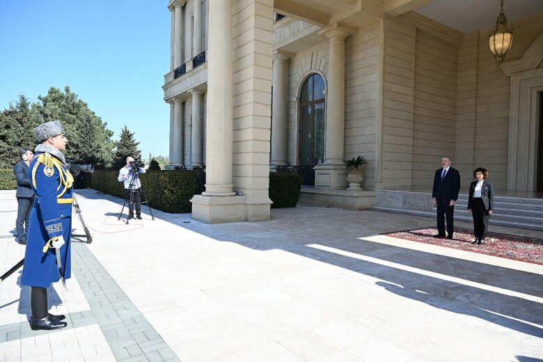 Fəxri qarovul dəstəsi hərbi marşın sədaları altında Azərbaycan prezidenti İlham Əliyevin və Şimali Makedoniya prezidenti Qordana Silyanovska-Davkovanın qarşısından keçib.