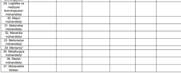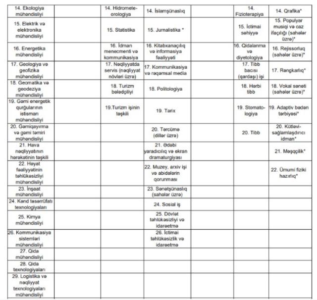 Bundan başqa, “Azərbaycan Respublikasının ali təhsil müəssisələrinə tələbə qəbulu Qaydaları”na 1 saylı əlavə “İxtisas qrupları və ixtisaslar” Nazirlər Kabinetinin müvafiq qərarı ilə təsdiq edilmiş “Ali təhsilin bakalavriat səviyyəsi üzrə ixtisasların Təsnifatı”na uyğunlaşdırılıb. Uyğunlaşdırma zamanı müvafiq ixtisas qruplarına aşağıdakı yeni ixtisaslar əlavə edilib: