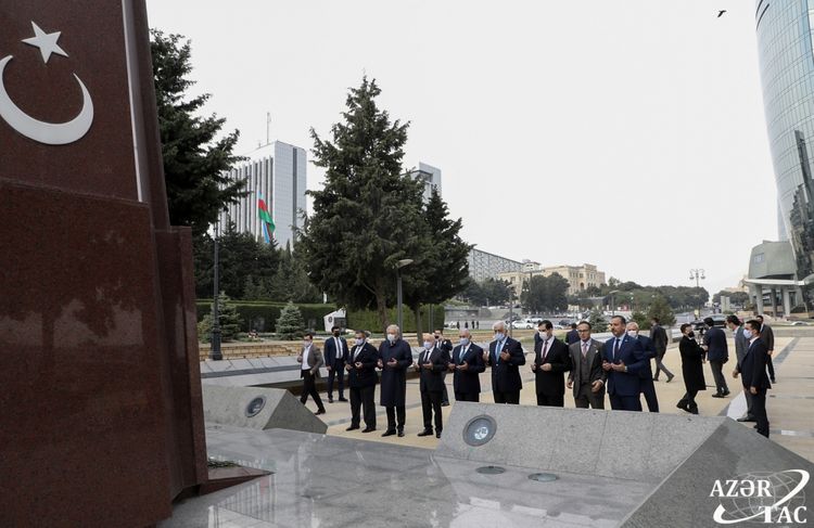 Türkiyənin keçmiş Baş Naziri, həmçinin Şəhidlər xiyabanında qəhrəman türk əsgərlərinin xatirəsinə ucaldılmış abidəni ziyarət edərək önünə tər çiçəklər qoyub.