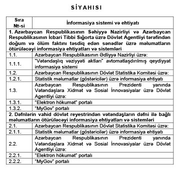 Məlumata görə, doğum və ölüm faktını təsdiq edən sənədlər üzrə məlumatların, habelə vətəndaşların dəfni ilə bağlı məlumatların Elektron Hökumət İnformasiya Sistemi vasitəsilə ötürüləcəyi aidiyyəti dövlət informasiya ehtiyatlarının və sistemlərinin Siyahısı aşağıdakı kimidir:
