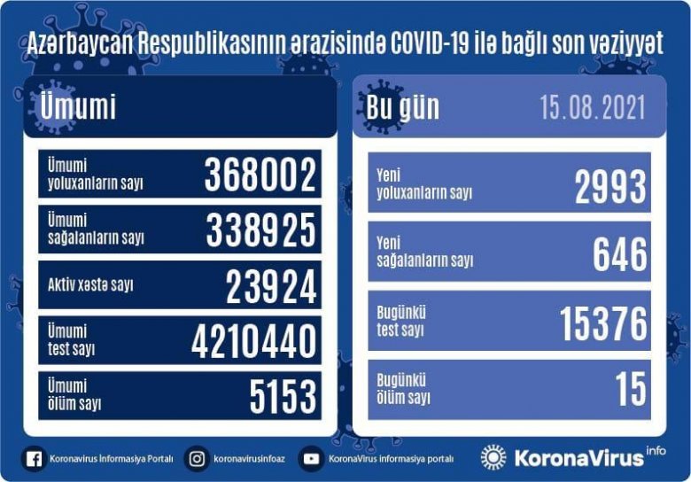 Azərbaycanda koronavirusa daha 2993 yeni yoluxma faktı qeydə alınıb, 646 nəfər müalicə olunaraq sağalıb.