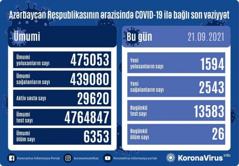 Azərbaycanda daha 1594 nəfər koronavirusa yoluxub, 26 nəfər ölüb - Cədvəl