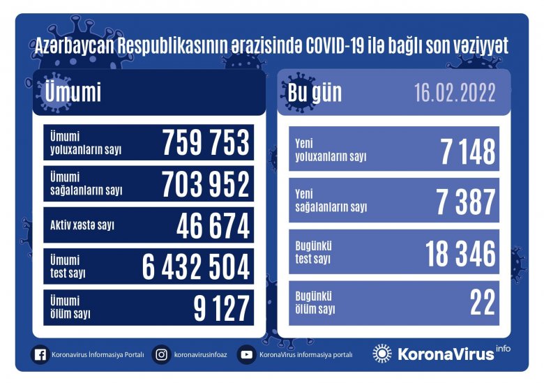 Azərbaycanda daha 7148 nəfər koronavirusa yoluxub, 7387 nəfər müalicə olunaraq sağalıb.