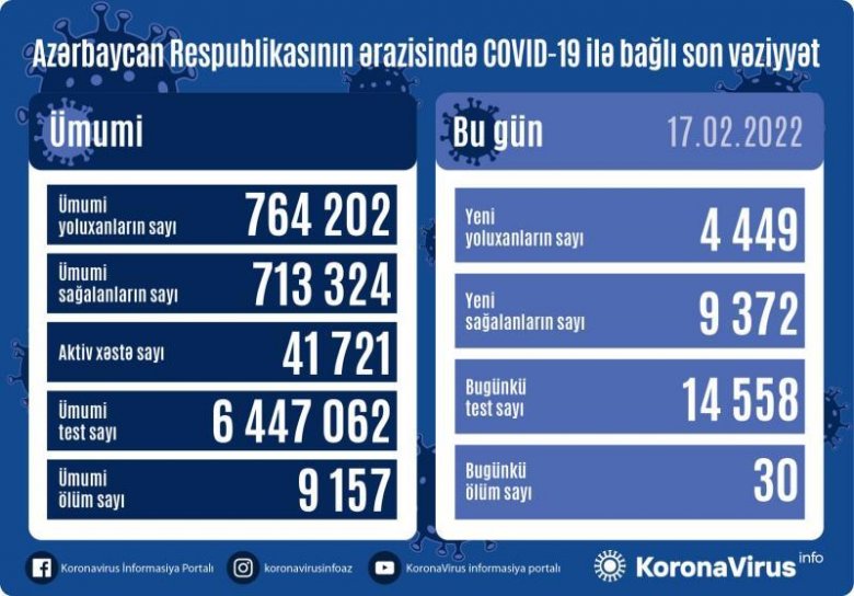 Azərbaycanda daha 4449 nəfər koronavirusa yoluxub, 9372 nəfər müalicə olunaraq sağalıb.