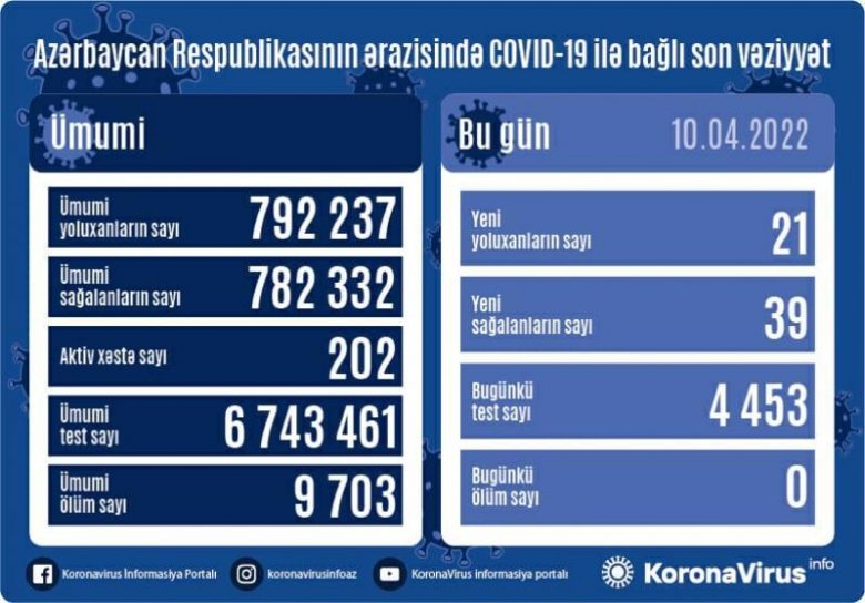 Azərbaycanda koronavirus (COVID-19) infeksiyasına 21 yeni yoluxma faktı qeydə alınıb, 39 nəfər müalicə olunaraq sağalıb.