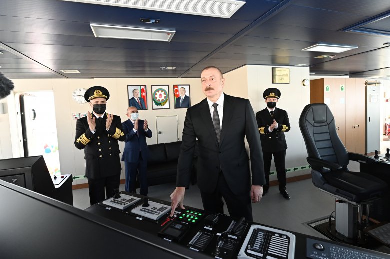 Gəmi-bərə ilə tanış olan Prezident İlham Əliyev daha sonra onun işə salınmasını bildirən düyməni basıb.