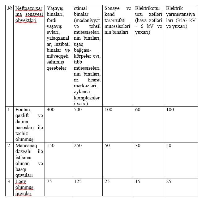 xəbər verir ki, Baş Nazir Əli Əsədovun qərarına əsasən, əhalinin sağlamlığını, ətraf mühiti və əmlakı dənizdə və quruda neft-qaz əməliyyatları zamanı yarana biləcək qəzalardan mühafizə etmək üçün bu obyektlər ətrafında xüsusi mühafizə zonaları müəyyən edilmişdir. Neftqazçıxarma sənayesi obyektlərindən yaşayış binalarına, fərdi yaşayış evlərinə, yataqxanalara, ictimai və inzibati binalara, müvəqqəti salınmış qəsəbələrə, sənaye və kənd təsərrüfatı müəssisələrinə, elektrikötürücü xətlərinə və elektrik yarımstansiyalarına qədər minimum məsafələr (metrlə) aşağıdakı kimi müəyyən olunub: