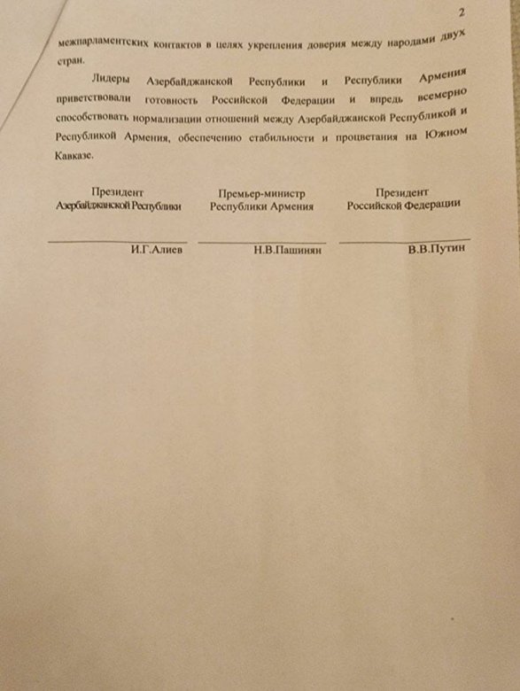 Azərbaycan Respublikası və Ermənistan Respublikasının liderləri Rusiya Federasiyasının Azərbaycan Respublikası ilə Ermənistan Respublikası arasında münasibətlərin normallaşmasına, Cənubi Qafqazda sabitliyin və rifahın təmin edilməsinə bundan sonra da hər cür töhfə verməyə hazır olduğunu alqışladılar”.