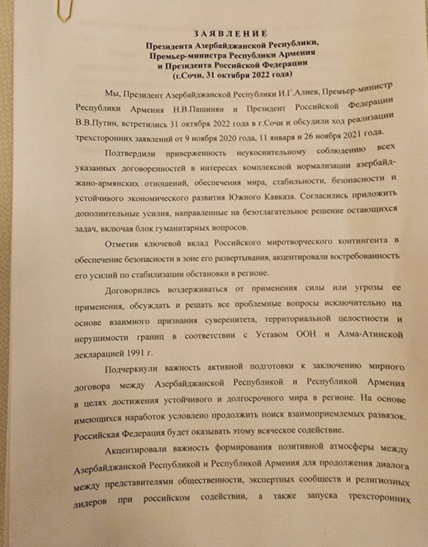 “Biz Azərbaycan Respublikasının Prezidenti İlham Əliyev, Ermənistan Respublikasının Baş naziri Nikol Paşinyan və Rusiya Federasiyasının Prezidenti Vladimir Putin 2022-ci il oktyabrın 31-də Soçidə görüşdük və 9 noyabr 2020-ci il, 11 yanvar və 26 noyabr 2021-ci il üçtərəfli bəyanatların icrasını müzakirə etdik.