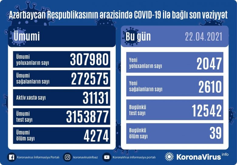 Azərbaycanda 2148 yeni yoluxma faktı qeydə alınıb, 30 nəfər ölüb