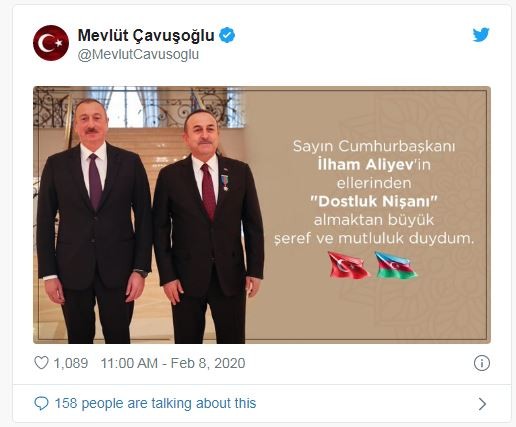 Çavuşoğlu İlham Əliyev tərəfindən təltif olunmasından yazdı: "Böyük şərəf və xoşbəxtlik duydum”