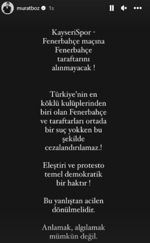 "Kayserispor -Fənərbağça matçına "Fənərbağşa" tərəfdarı alınmayacaq. Türkiyənin ən köklü klublarından biri olan "Fənərbağça" tərəfdarları ortada bir cinayət yoxkən, bu şəkildə cəzalandırıla bilməz. Tənqid və etiraz təməl demokratik bir haqdır. Bu səhvdən təcili dönmək lazımdır. Anlamaq, qəbul etmək mümkün deyil".