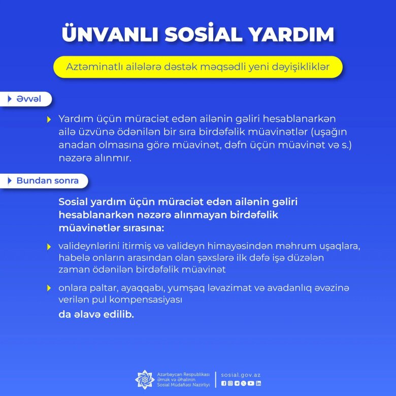 Prezident İlham Əliyevin tapşırığına əsasən, aztəminatlı ailələrin ünvanlı sosial yardıma əlçatanlığının artırılması, sosial yardımın təyinatı mexanizminin təkmilləşdirilməsi və yardımın təyin olunma meyarlarının yumşaldılması istiqamətində növbəti addım kimi Nazirlər Kabineti sosial yardımla bağlı qaydalarda yeni dəyişikliklər edib.