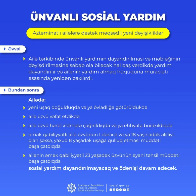 Ailə tərkibində ünvanlı yardımın dayandırılması və məbləğinin dəyişdirilməsinə səbəb ola biləcək hal baş verdikdə sosial yardım dayandırılır və ailənin ünvanlı yardım almaq hüququna müraciəti əsasında yenidən baxılırdı. Yeni dəyişikliklə bundan sonra ailədə yeni uşaq doğulduqda və ya övladlığa götürüldükdə, ailə üzvü vəfat etdikdə, ailə üzvü hərbi xidmətə çağırıldıqda və ya ehtiyata buraxıldıqda, əmək qabiliyyətli ailə üzvünün I dərəcə və ya 18 yaşınadək əlilliyi olan şəxsə, yaxud 8 yaşadək uşağa qulluq etmə müddəti başa çatdıqda və ailənin əmək qabiliyyətli 23 yaşadək üzvünün əyani təhsil müddəti başa çatdıqda sosial yardım dayandırılmayacaq və ödənişi davam edəcək.