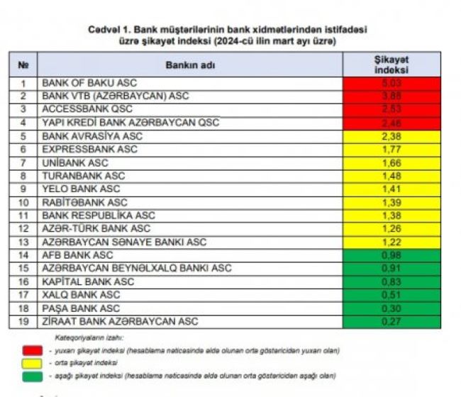 Ən çox şikayət edilən banklar siyahısında “Bank VTB Azərbaycan” 3,88 indeksi ilə ikinci, 2,53 indeksi ilə "Accessbank" üçüncü, “Yapı Kredi Bank Azərbaycan” isə 2,46 indeksi ilə dördüncü olub. Digər banklar üzrə göstəricilər şikayət indeksi orta və aşağı səviyyədə hesab edilir(İqtisadiyyat).