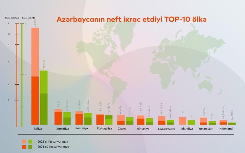 Bu ilin beş ayında Azərbaycan İtaliyaya 3 milyard 88 milyon 100,61 min ABŞ dolları dəyərində 5 milyon 730 min 746,71 ton, Xorvatiya 408 milyon 862,68 min ABŞ dolları dəyərində 744 min 703,91 ton, Rumıniya 377 milyon 106,29 min ABŞ dolları dəyərində 683 min 725,65 ton xam neft ixrac edib. Portuqaliya 310 milyon 369,1 min ABŞ dolları dəyərində 576 min 34,89 ton və Çexiya 304 milyon 667,44 min ABŞ dolları məbləğində 558 min 693,27 ton neft tədarük edilib(Report).
