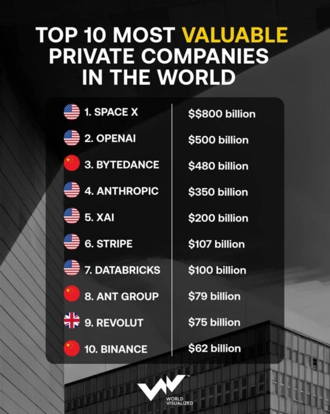 Siyahıya 800 milyard dollar dəyərində olan və İlon Maskın rəhbərlik etdiyi "SpaceX" kosmik şirkəti başçılıq edir. Bu şirkətin son illərdə gəlirlərinin artması əsasən "Starlink" peyk şəbəkəsi və kosmik texnologiyalara maraqla bağlıdır. Üstəlik, 2026-cı ildə də yüksək həcmdə aksiyaların olacağı ehtimalı var.