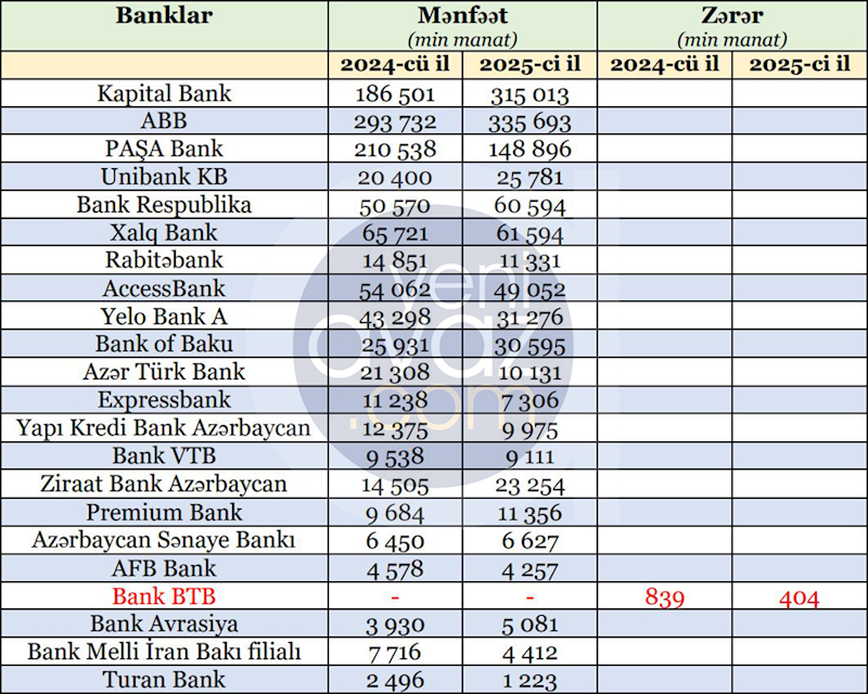 Azərbaycanda fəaliyyət göstərən banklar 2025-ci il üçün maliyyə hesabatlarını açıqlayıblar.