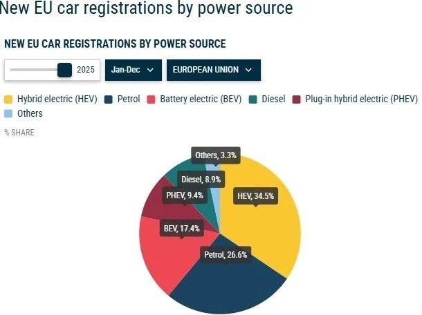 2025-ci ildə AB bazarlarında 10,8 milyondan çox yeni avtomobil satılıb. Mənfi dinamika yalnız ənənəvi mühərrikli avtomobillər seqmentində qeydə alınıb.