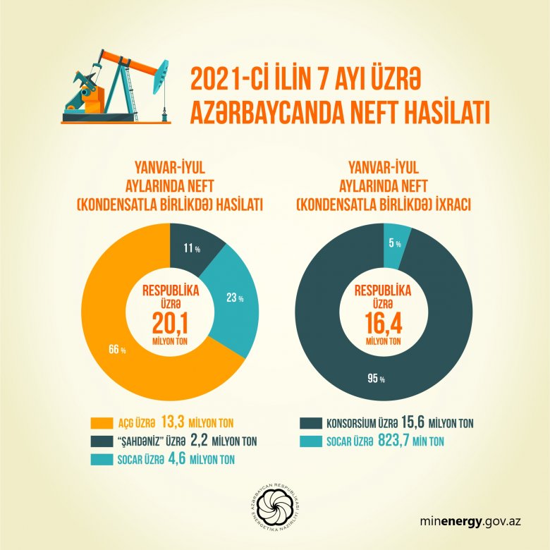 2021-ci ilin yanvar-iyul ayları ərzində Azərbaycanda təxminən 20,1 milyon ton neft (kondensatla birlikdə) hasil edilib. Operativ məlumatlara əsasən, neft (kondensatla birlikdə) hasilatı ötən ilin müvafiq dövrü ilə müqayisədə təxminən, 522,2 min ton az olub.