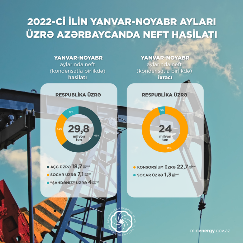2022-ci ilin yanvar-noyabr ayları ərzində ölkədə 29,8 milyon ton neft (kondensatla birlikdə) hasil edilib. Neft hasilatının 18,7 milyon tonu “Azəri-Çıraq-Günəşli”nin, 4 milyon tonu (kondensat) “Şahdəniz”in payına düşüb. SOCAR üzrə neft (kondensatla birlikdə) hasilatı 7,1 milyon ton təşkil edib.