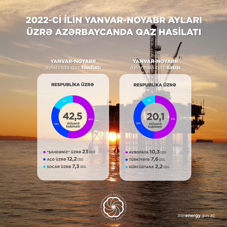 2022-ci ilin yanvar-noyabr ayları üzrə Azərbaycanda 42,5 milyard kubmetr təbii qaz hasil edilib.