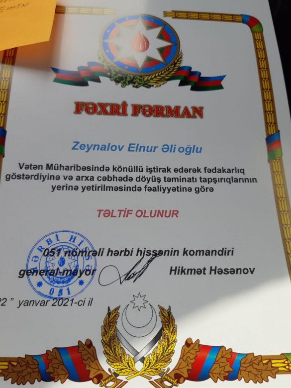 44 gün davam edən savaşda və sonrakı günlədə Ordumuza daim mənəvi dayaq duran, ön xətdə əsgər və zabitlərlə görüşən sənət adamlarından biri də Əməkdar artist, Prezident mükafatçısı Elnur Zeynalov idi. Akademik Opera və Balet Teatrının solisti, tanınmış xanəndə daim döyüş bölgələrinə səfər edir, ifası ilə əsgərlərimizi ruhlandırır, şəhid ailələrinə, qazilərimizə baş çəkərək onlara maddi dəstək göstərirdi. İstedadlı sənətçinin Vətən müharibəsi zamanı göstərdiyi bu fəaliyyət və vətəndaşlıq mövqeyi diqqətdən kənarda qalmayıb. Parlaq Qələbəmizin əfsanəvi qəhrəmanlarından sayılan, general-mayor Hikmət Həsənov Əməkdar artist Elnur Zeynalovu Fəxri fərmanla təltif edib. “Madagiz Fatehi” ləqəbi ilə tanınan, “Qarabağ” ordenli generalın imzaladığı sənəddə tanınmış xanəndənin Vətən müharibəsində fədakarlığı və arxa cəbhədə döyüş təminatlı tapşırıqların yerinə yetirilməsindəki xidmətləri xüsusi qeyd olunub.
