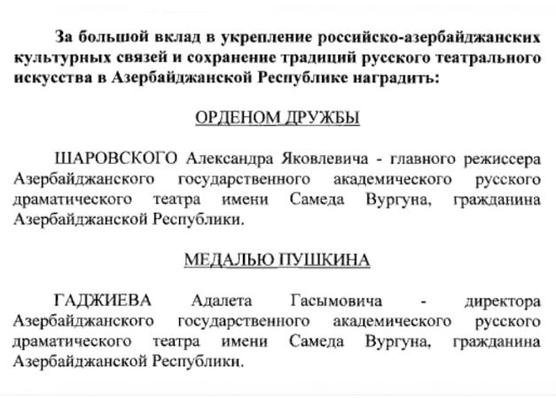 Reyting.az-ın məlumatına görə, Vladimir Putinin 11 may 2021-ci il tarixli Fərmanı ilə Səməd Vurğun adına Azərbaycan Dövlət Akademik Rus Dram Teatrının baş rejissoru Aleksandr Şarovski “Dostluq” ordeni ilə, teatrın direktoru Ədalət Hacıyev isə “Puşkin” medalı ilə təltif edilib.