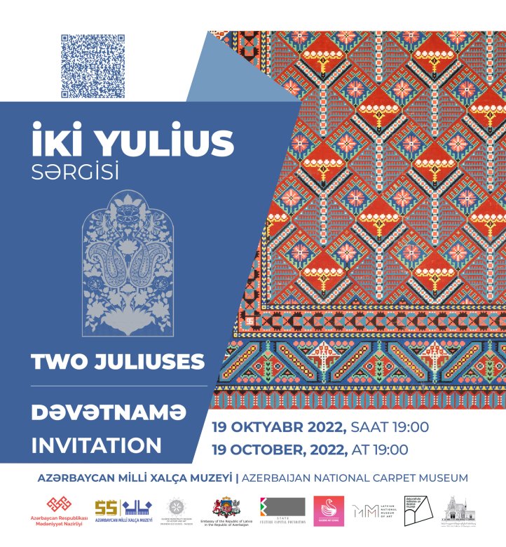 Oktyabrın 20-dən Azərbaycan Milli Xalça Muzeyində “İki Yulius” sərgisi ictimaiyyətə açılacaq. Sərgi AMXM, Gülbene Bələdiyyəsi Tarix və İncəsənət Muzeyi, Dekorativ İncəsənət və Dizayn Muzeyi, Latviya Milli İncəsənət Muzeyi, Gülbene İncəsənət Məktəbi, Gürcüstan İncəsənət Muzeyi – Mədəniyyət Tarixi Muzeyinin birgə təşkilatçılığı, Azərbaycan Respublikası Mədəniyyət Nazirliyi, Latviyanın Azərbaycandakı Səfirliyi, Latviya Dövlət Mədəniyyət Kapitalı Fondunun dəstəyi ilə keçiriləcək.