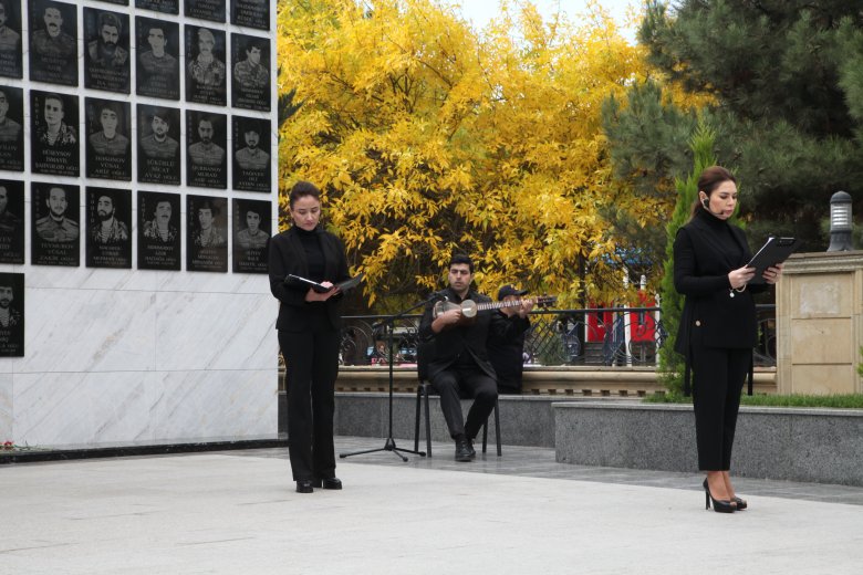 Reyting.az xəbər verir ki, əvvəlcə şəhidlərimizin xatirəsi bir dəqiqəlik sükutla yad edilib, abidə kompleksinin önünə gül dəstələri düzülüb.