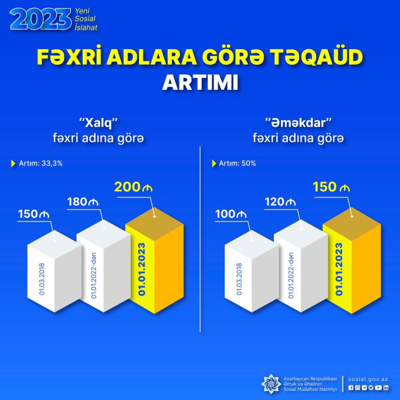 Fəxri adlara görə aylıq təqaüdün məbləği 2023-cü il yanvarın 1-dən xalq yazıçısı, xalq şairi, xalq artisti və xalq rəssamı üçün 200 (iki yüz) manat, əməkdar elm xadimi, əməkdar incəsənət xadimi, əməkdar artist, əməkdar rəssam, əməkdar mədəniyyət işçisi, əməkdar müəllim, əməkdar həkim, əməkdar memar, əməkdar bədən tərbiyəsi və idman xadimi, əməkdar dövlət qulluqçusu, əməkdar jurnalist, əməkdar mühəndis, əməkdar hüquqşünas, əməkdar kənd təsərrüfatı işçisi, əməkdar pilot, əməkdar tibb işçisi üçün 150 (yüz əlli) manat müəyyən edilib.