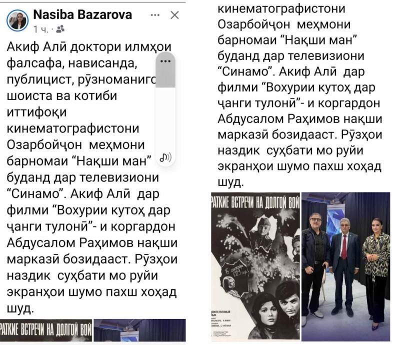 Düşənbə söhbətinə qayıdaraq, deyim ki, “Sinema TV”də istedadlı teleaparıcı Nəsibə xanım mənimlə bağlı maraqlı veriliş hazırladı. “Nəqşi mən” adlanan bu proqramda Nəsibə xanım tacik tamaşaçısına vaxtilə “Tacikfilm”də çəkilən “Uzun müharibədə qısa görüşlər” filminin baş qəhrəmanını geniş təqdim etdi. Studiyada ətraflı söhbət zamanı biz efirdə həm filmlə bağlı xatirələrdən, o illərin çəkiliş proseslərindən danışdıq, həm də sonrakı illərdə mənim “Azərbaycanfilm”də yaratdığım “Tütək səsi” filmindəki Tapdıq, “Arxadan vurulan zərbə” filmindəki Fazil müəllim obrazları haqqında danışdıq. Verilişi hazırlayarkən Nəsibə xanım həmin filmlərdən bəzi epizodları da montajı zamanı müsahibəmizə illüstrasiya kimi daxil edib.
